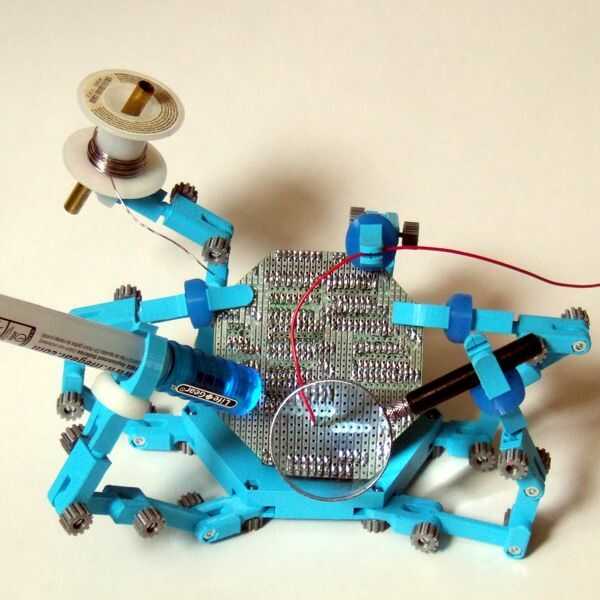 La mano tiene seis configurable, bloqueo en su lugar, brazos con garras intercambiables. Mientras que esta versión era 3d impreso, una plantilla similar podría hacerse con acrílico u otro material de lámina de plástico. Incluso podría ser hecho de madera contrachapada fina. Tres capas podrían ser laminadas juntos para hacer los brazos.