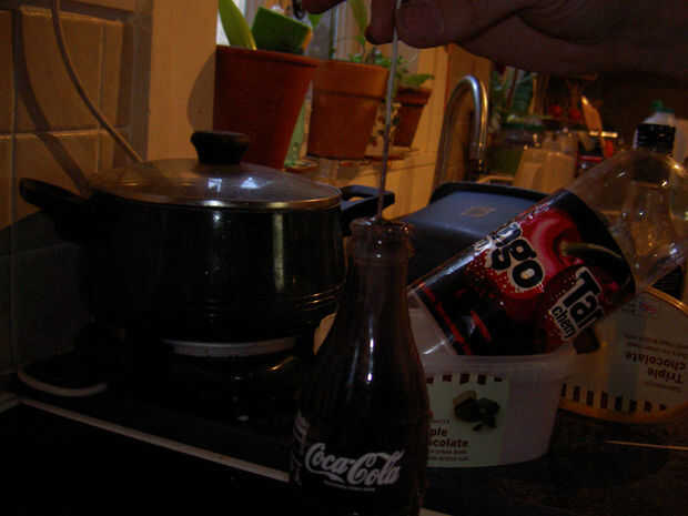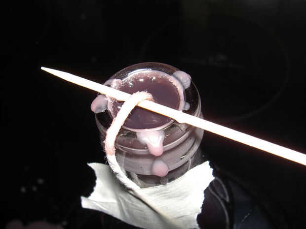 Para mantener la mecha recta cualquiera puede mantener inmóvil durante mucho tiempo, o si no quiere estar allí para las edades, puede cuelgue sobre el lado de la botella (cuidado, puede estar caliente) y luego usar alguna cinta adhesiva para asegurarlo, asegurándose de que la mecha no inclinarse a un lado y en su lugar, sale hacia la parte superior de la botella.