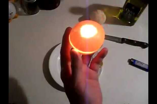 usted necesita:1. una naranja2. un cuchillo3. aceite de oliva (cualquier tipo)4. un encendedor o una cerilla (o cualquier cosa que se puede encender un fuego)Paso 1: Cortar la naranja por la mitad Con cuidado corte la naranja en 2 piezas, cada una co