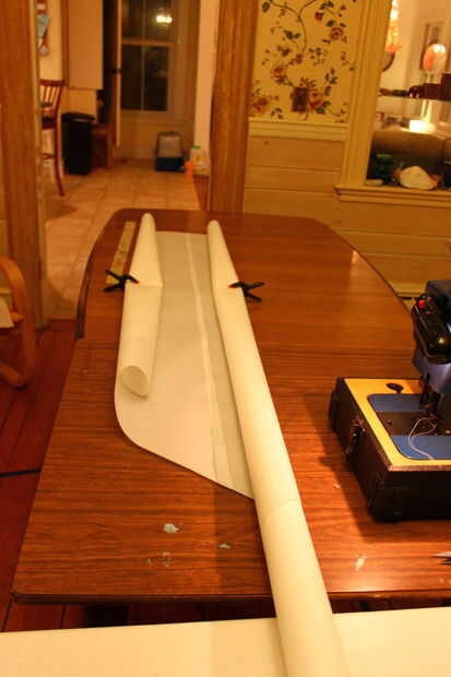 Ponga la vela detrás hacia fuera en el piso, decidir que vas a coser primero (¿por qué no el pequeño que está en la parte superior para arrancadores?) la costura y enrollar la vela como un desplazamiento a ambos lados de esa costura. Usar pinzas de resorte para mantener todo en su lugar.