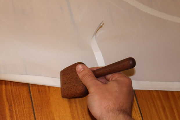 Encontré un trozo de cinta con el borde, pero no tire el respaldo todo. Y luego mentó la línea de doblez. Usé una pequeña herramienta de costura-frotamiento que hice, pero una toma de corriente o la parte posterior de la cuchara de madera trabajo bien también. He arrugado sobre un pie a la vez, entonces había quitado el respaldo de la cinta y pegado abajo, continuando a suave con mi goma de costura.