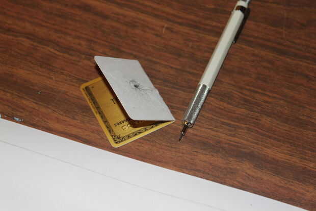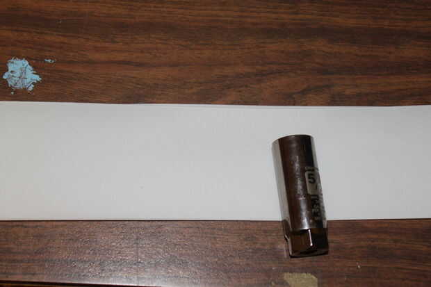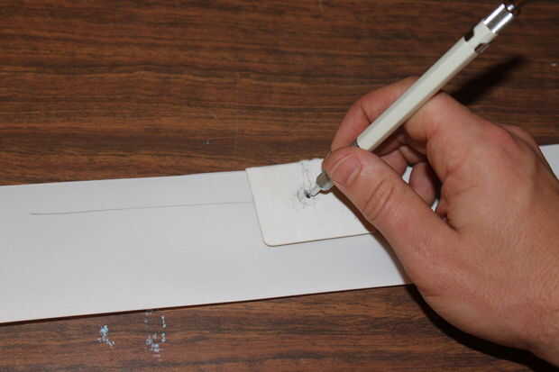 A continuación, vamos a doblar la cinta otra vez, aproximadamente en tercios. Va a instalar sus ojales en la parte de doble plegado, por lo que una consideración clave aquí es lo que es lo suficientemente amplia como para fijar los ojales. Este segundo doblez debe ser de un ancho constante, así que hice una pequeña marca de costura calibre de una pieza doblada de la cartulina con un agujero que penetra en el lugar correcto. Ejecutando esto en el borde de la tela con un lápiz en el agujero, puede dibujar una línea de pliegue perfecto a.