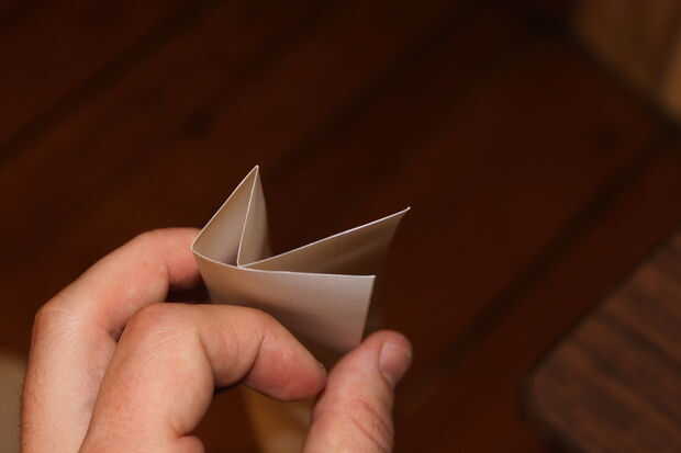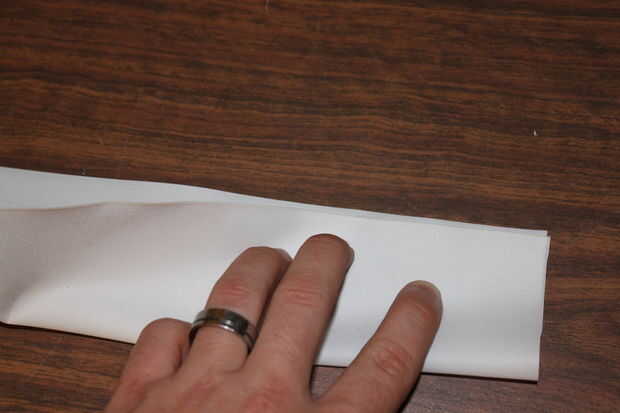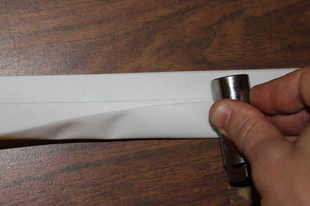 El primer paso es doblar por la mitad, pero no perfectamente alineados los bordes. Deje que la capa superior caída sobre 1/16"- 1/8" detrás del borde de la capa inferior, porque se arrastran durante el siguiente paso. Pliegue de este doblez con una goma de costura, zócalo, cuchara de madera, la parte posterior de sus tijeras, etc..