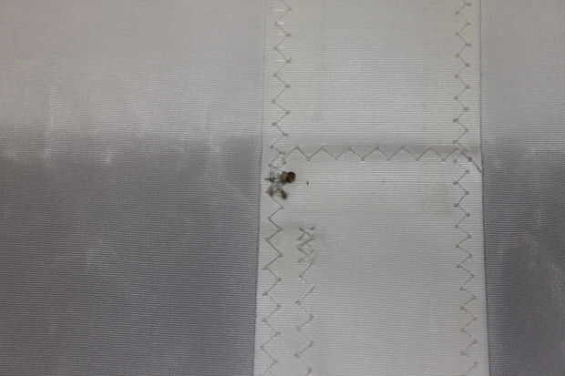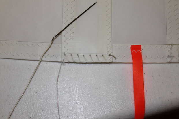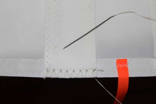 Los extremos de la sanguijuela de los bolsillos de listón son con sutura manual con cordeles pesados. Comenzar en la parte inferior del bolsillo y trabajar su camino hasta la parte superior con una puntada oversew. Tomar un giro extra o dos en la parte superior usando el mismo agujero. A continuación, use los mismos agujeros y suturar detrás abajo, haciendo un bonito patrón en forma de x. Acabado de los extremos del hilo con nudos grandes y derretir los extremos amargos del hilo con un encendedor.
