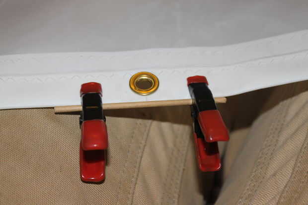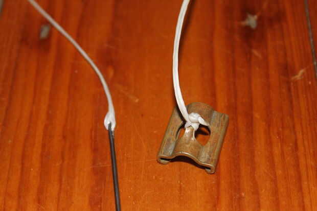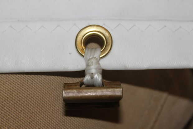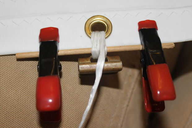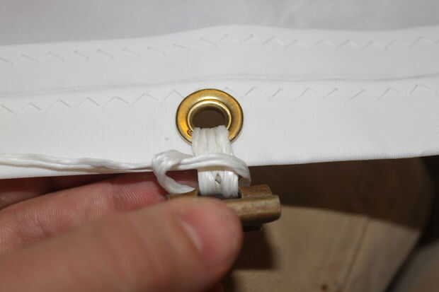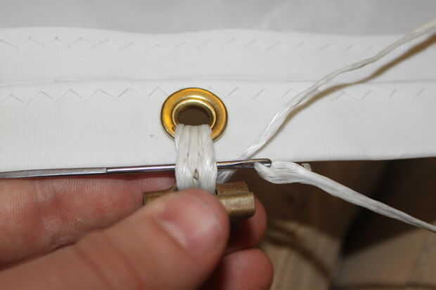 En primer lugar, la cera de un poliéster pesado agarrar guita, al igual que al coser en el cabecero. Ejecutar a través de una aguja grande y atar un nudo al final. Este extremo anudado a través de la fianza de la corredera y vaca-enganche lo en el lugar. Enrolle la cuerda a través de la arandela y el gancho deslizante varias veces, manteniendo una tensión uniforme a medida que avanza. Retire el palillo del espaciador. Pase la aguja una vez más a través de la fianza de la diapositiva y luego a través del cuerpo de la toma donde antiguamente era el palo de espaciador. Lazo de unos enganches de media apretadas alrededor del cuerpo de la toma. Tensar estas realmente, entonces corta la cuerda y derretir el extremo con un mechero.