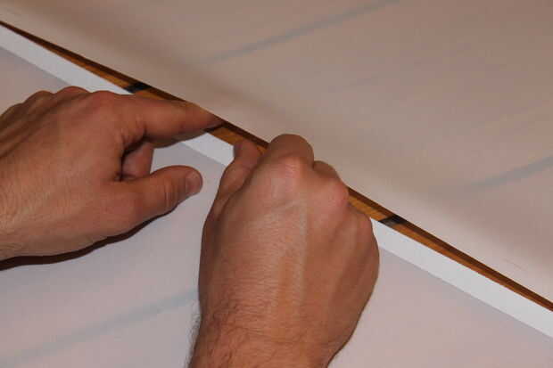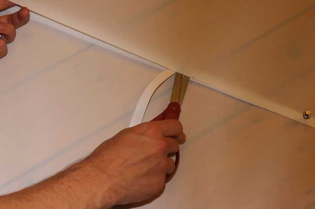 Porque se anota la ubicación de la broadseams en el paso anterior, sabes donde está cada parte recta. Meter un alfiler en la costura fuera de cualquiera de los extremos de la parte recta, para evitar que cosas cambiar alrededor mientras trabaja. Levantar el paño en el centro, despegue el revestimiento de la cinta pegajosa en la sección recta sólo y suavizar la tela hacia abajo sobre él.