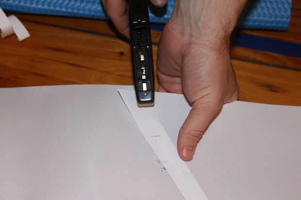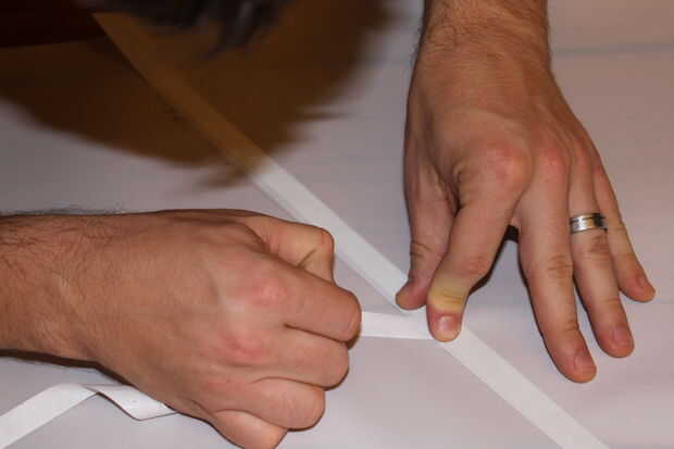Levantar el paño, retire el papel de la cinta y poco a poco trabajando desde el punto de partida de la broadseam, hacer su camino hacia la sanguijuela, suavemente curvado y pegando la tela juntos a lo largo de la línea dibujada. El paño no particularmente querrá hacer esto mientras acostado en el piso, por lo que tendrá que agitar o ventilador de la tela un poco primero. La clave es asegurarse de que la costura se adhiera uniformemente a lo largo de la línea dibujada, y no hay burbujas entre la cinta y la tela indicando un desalineamiento. Cuando haya terminado, siga adelante y poner una grapa de seguridad a las afueras de la sanguijuela, para asegurarse de que la costura no comienza a pelar aparte.