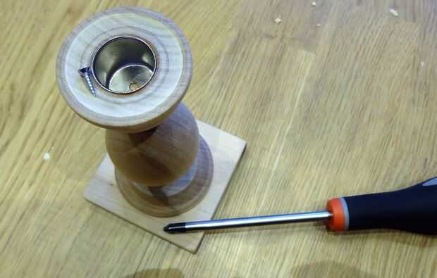 Pulido las partes de la vela que no quería pintar. He utilizado cera de abeja. Después de tomé la vela del huevo del torno y montado en una taza de hierro para evitar que el candelabro de quemar.
