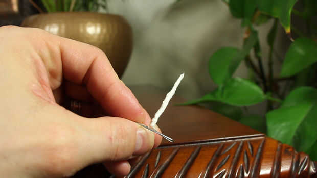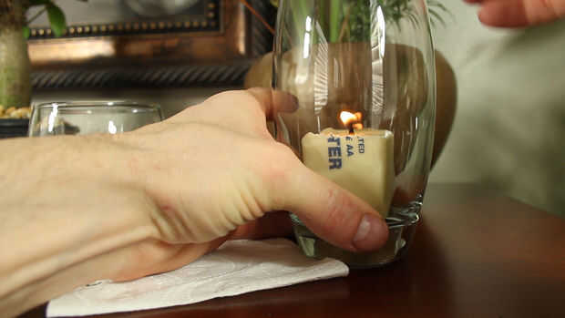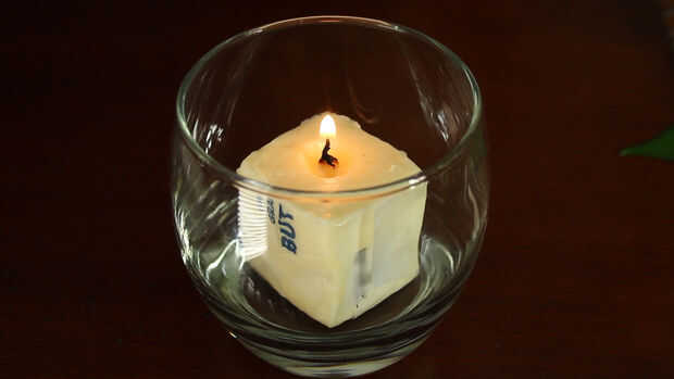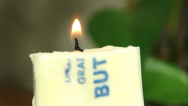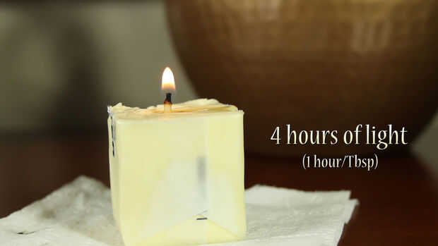 Nota: Después de un par de horas, la mantequilla se calienta hasta el punto donde funde y puede caer la mecha. En este caso, es útil tomar un clip y hacer un soporte para la mecha. Para hacer esto desde el principio, solo inserte la mecha y clip junto desde la parte inferior del bloque de mantequilla.