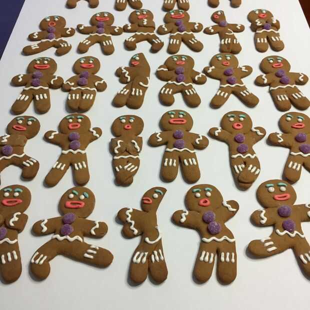 Primero mis actores - usé mi cortador de galletas para hacer formas de Gingy. Antes de que fueron al horno los moldeados en diferentes posiciones y después fueron al horno les decoré con diferentes bocas.