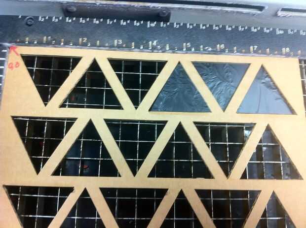 Una vez haya 20 buenas piezas podemos grabar los números en ellos. Colocar cada triángulo en uno de los agujeros de la plantilla de cartón sobre la superficie del corte del cortador del laser. Ahora usted puede utilizar el mismo archivo que utilizamos para hacer la plantilla, pero asegúrese de configurar el láser para grabar sólo! No queremos hacer otra vez alrededor de los orificios.