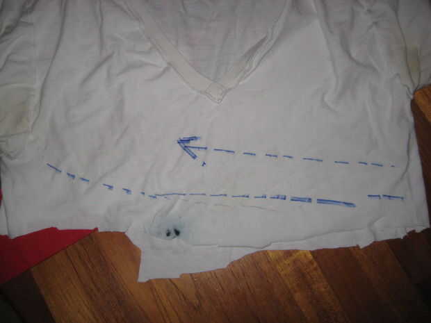 Inicio en la parte inferior de la camisa y el corte de moda "alrededor" de una espiral (ver imagen). La tira puede ser tan amplia como quieras, dependiendo de lo grueso que desee la cuerda al ser, pero en general, 1,5 pulgadas es una cantidad segura.