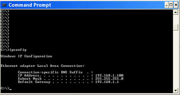 - Descubrir la dirección ip local del ordenador portátil. Para hacer esto ir a "Start\Programs\Accesories\Command pronto" y cuando se abre la ventana de terminal tipo "ipconfig". Escribir "Dirección IP" y la cabeza a otro ordenador en tu red local.