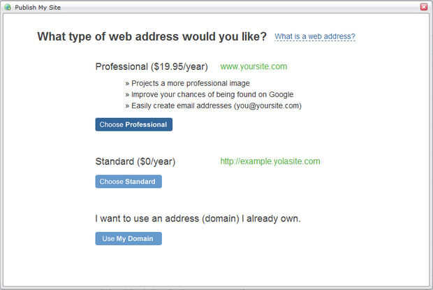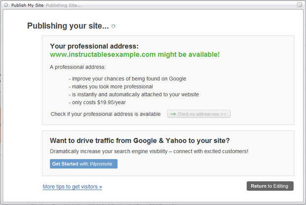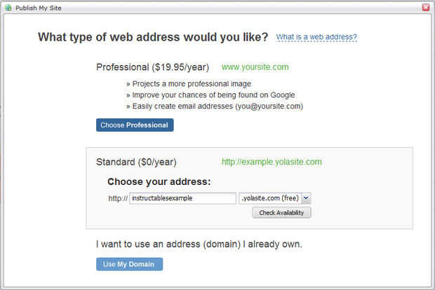 Ahora que ya sabes lo que quieres que se vea como quieras nombrarlo. Introduzca el nombre del sitio (esta no es la URL, es el nombre de su sitio para la lista de sitios en su cuenta por lo que se puede identificar el sitio web de la edición). Este instructable va a mostrar cómo hacer un sitio web, voy a hacer el blog para otro instructivo, por favor seleccione sitio web para el tipo de su sitio. A continuación, haga clic en elegir una dirección Web. Ahora debe cargar el editor del sitio de yola con un cuadro de diálogo, como dije que esto puede ser 100% gratis si pulsas elige estándar (example.yolasite.com), o si quieres tener tu propio dominio (www.example.com) usted puede pagar $19,95 al año y proyectaría una imagen más profesional, mejorar sus posibilidades de ser encontrado en Google, y viene con una dirección de correo electrónico de usted si usted ya tiene un dominio (con cualquier servicio) y haga clic usar mi dominio y haga clic en cómo hago esto entonces le daría una dirección IP de tu dominio para que apunte a y haga clic en lo han hecho entonces pruebe la configuración. Yo solo voy a la norma para mi sitio 100% gratis, que luego quieres entrar lo que usted quiere que su nombre de dominio (dirección web) comprobar disponibilidad, si su dominio está disponible y luego haga clic en usar esta dirección para continuar, haga clic en. Después de hacer todo lo que entonces debería parecerse a la imagen (5) quinto (publican tu sitio)!