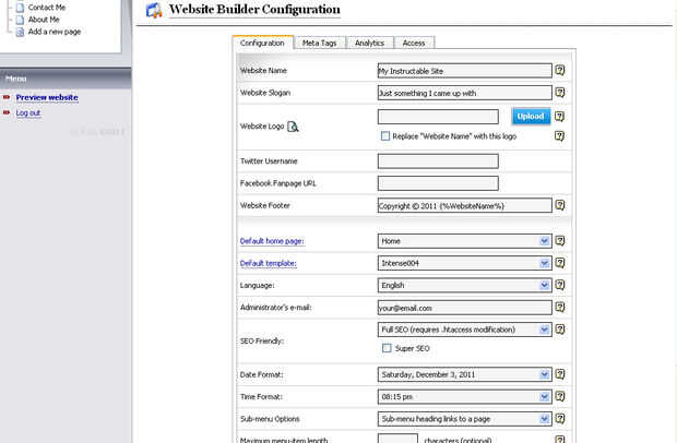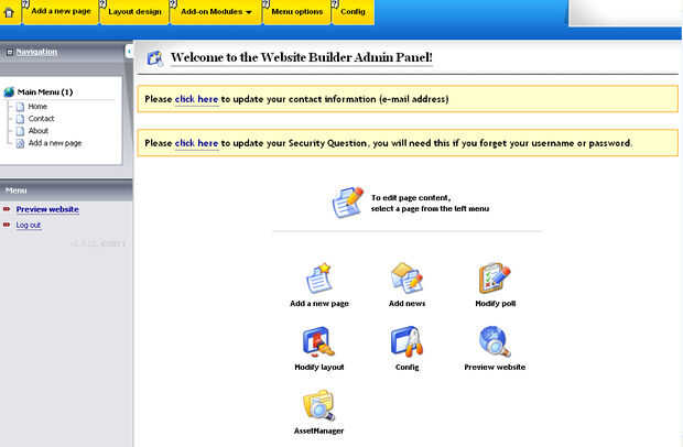 Paso 3: La siguiente página será el admin.php de su sitio. Puede añadir una nueva página, cambiar el diseño (imagen de fondo, color, etc.), agregar Galería, formulario de contacto, encuestas, etc., cambiar cómo serán menús ver e.g. - Añadir sub menús y mucho más.