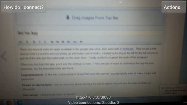 Mira en la parte inferior de la pantalla, y verás una dirección IP. En mi caso, lo de 10.0.0.21:8080. Si todo lo que quieras es poder mantener un ojo en algo desde otra habitación en la casa, ¡ listo! Misión cumplida!