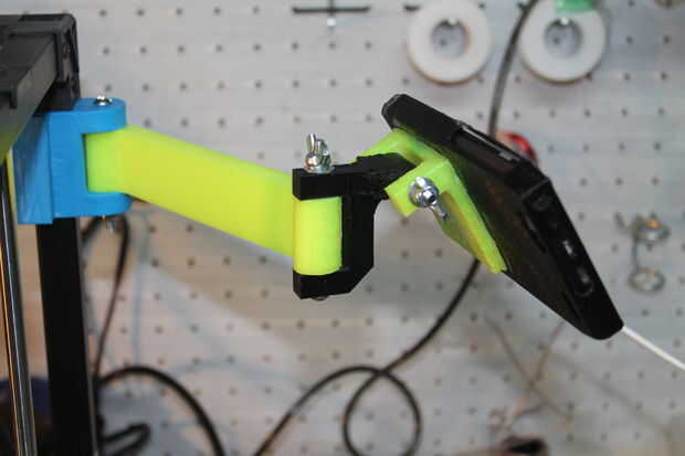 Esto no se aplica a todo el mundo, pero pensé que incluiría este paso sobre mi uso personal de la webcam. Como mencioné, yo quería ser capaz de mantener un ojo en las cosas mientras se está ejecutando pero estoy lejos de la casa. Por lo tanto, imprimí un brazo, soporte de montaje y una caja del teléfono del teléfono. Todo está montado y conectado al chasis de la impresora.