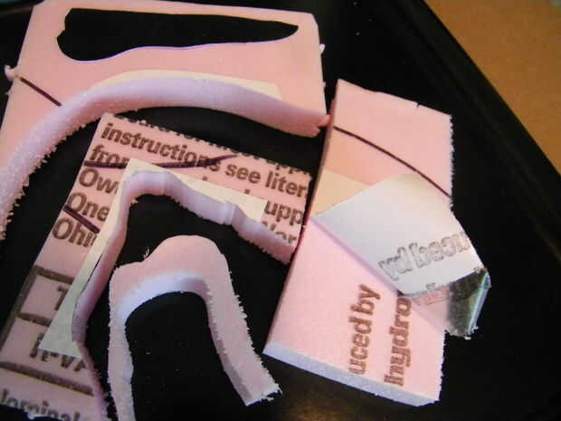 Parte 4 - ir afuera, póngase guantes y extendió su dropcloth (lo digo en serio aquí, esta materia es serio pegajosa) y la parte posterior del papel impreso de la computadora del aerosol con 3 M Super 77 y adherir en la parte de la película de cubierta de la espuma de aislamiento. Mantenga la espuma de su línea de spray para evitar que partes no deseadas de pegajosas. Una vez su dispositivo, debe secar unos 5 minutos.
