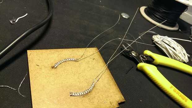 Cuando se ha soldado todo, rápidamente pase la plancha sobre el alambre para quitar cualquier globos grandes de la soldadura. Prueba de las conexiones con la batería de la moneda a la luz hacia arriba.