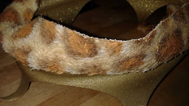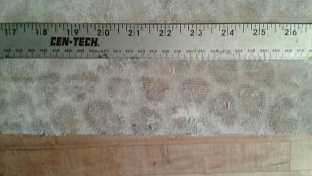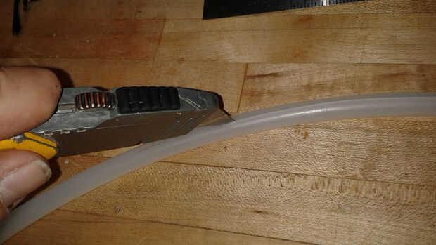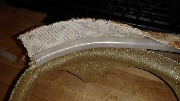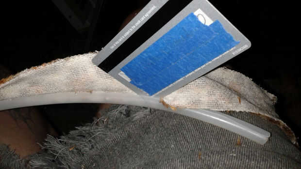 La venda fue hecha con una tira de material reciclado de la tapicería estirada sobre una sección de la fractura de la tubería de polietileno que se deslizó sobre la parte inferior de la corona. Usé una vieja tarjeta de crédito para deslizar el material en el apretado espacio entre la tubería y la corona.