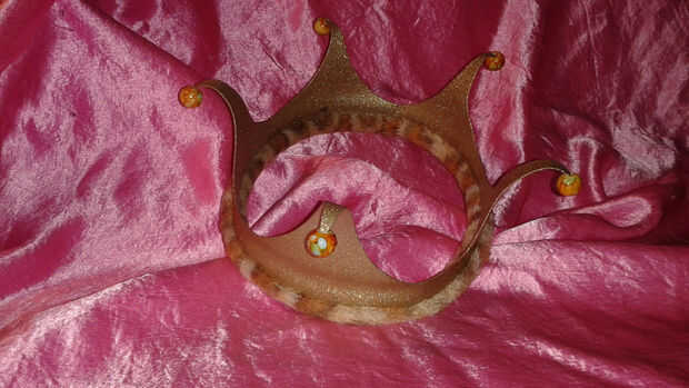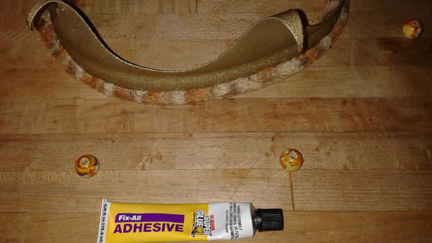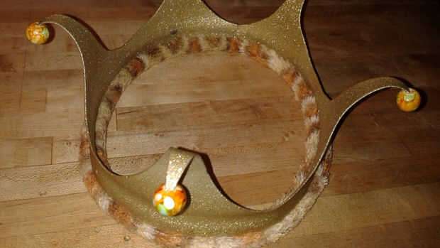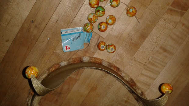 Quería añadir algún tipo de bolas a los extremos de los puntos para prevenir accidentes y añadir un poco de estilo. Miré en mi tienda, pero no tengo nada en el tamaño correcto. Bajé a la tienda de dólar a pasear y finalmente encontré una pulsera barata con fresco buscando perlas. La era amarillo y naranja con detalles en azul en un patrón orgánico. Fue un partido bonito con el oro y leopardo de la corona. Cortar la pulsera y me pega una perla al final de cada punto. Lo dejo reposar unas horas secar.
