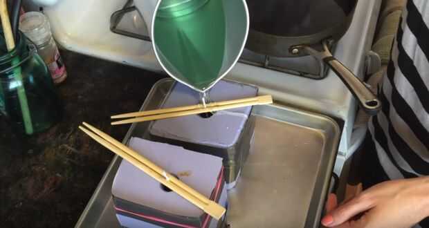 Nota: yo también aseguró los lados de mis moldes con gomas y cinta. Nada se filtró hacia fuera, así que en última instancia no era necesario, pero hacer este paso sobre una bandeja de labios en caso de tener derrames!