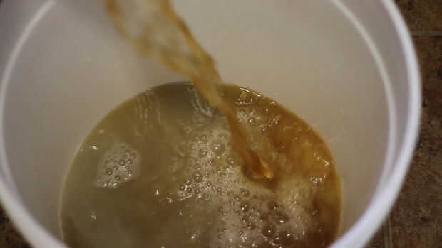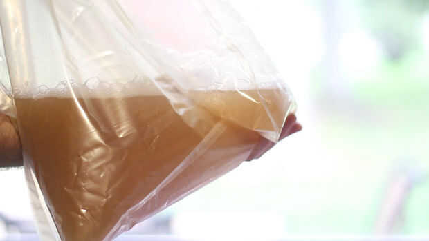 Añadir agua a la bolsa de concentrado, recapitularlo y darle una sacudida para que haces seguro que salir tanto del concentrado como sea posible. Volcar en el fermentador con el resto del jugo.