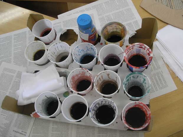 Ahora usted está listo para aplicar alguna pintura. Pintura en batik directa (polvo) se disuelven en agua según las instrucciones del fabricante en el paquete. Utilice otro Pincel ancho para aplicar diferentes colores!