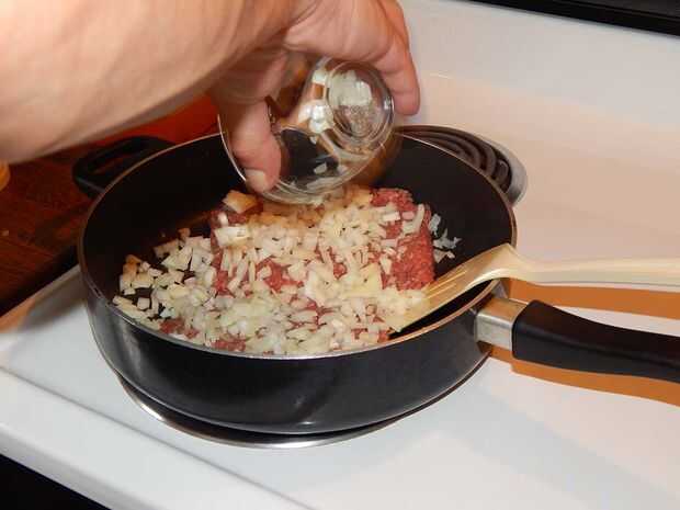 Que saquen su cacerola y dorar la carne con las cebollas. Cocine la carne hasta que esté casi cocido y la cebolla a marchitarse. Usted puede agregar su condimento si te gusta. Se pueden utilizar sal y pimienta al igual que la receta. Encontré esta receta en pinterest. Fue de Onceamonthcooking.com,