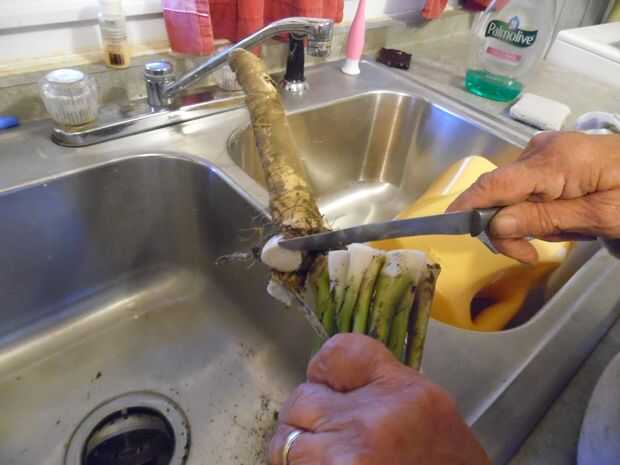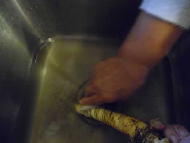 Corte la parte superior de la planta. Lavar la raíz en agua limpia, frotando con un scracher o cepillo para restregar.