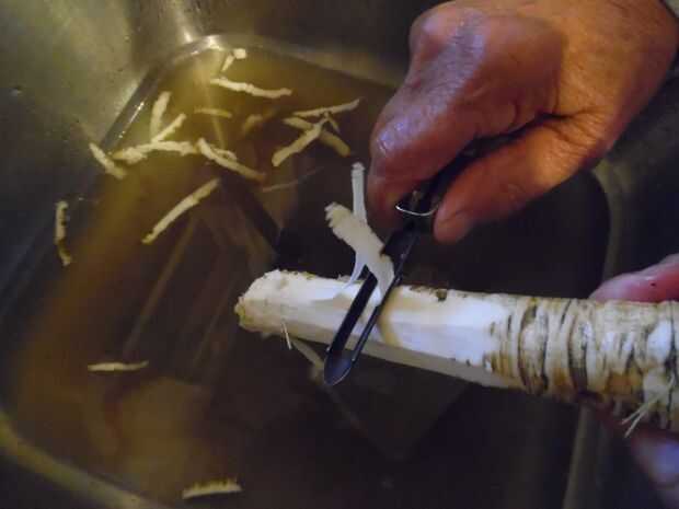 Nos encontró que lo mejor para pelar la raíz con un pelapapas. Después de pelar la raíz, cortar en trozos pequeños. En este punto encontrará que la raíz está comenzando a obtener picante.