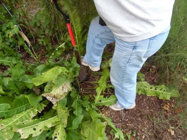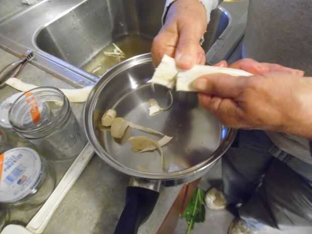 Cultivamos nuestro propio rábano, así que desenterrar las raíces. Si decides cultivar rábano, es aconsejable cultivarla en una zona más o menos contenida. Puede ser agresivo y se disemina fácilmente. Tenemos nuestro al lado del parche de espárragos, de nuestro jardín principal. No tire incluso los peelings donde que no quieras rábano para crecer. Puse las hojas en el parche. Puse los peelings en una bolsa de plástico y ponerlo en la basura.