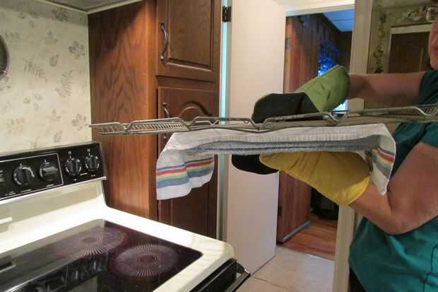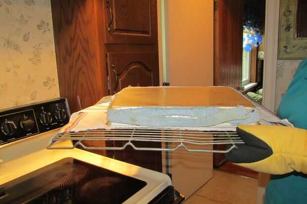 Coloque una toalla de plato limpio sobre una rejilla para enfriar. Cuando la tarta sale del horno, coloque la toalla y estante de enfriamiento en la parte superior del molde para pasteles. Cuidadosamente voltee todo por lo que el pan esté apoyado en el estante de toalla cubierta asegurándose de que no quemarse. Dejar para enfriar con la cacerola cubriéndolo. Suavemente Levante la cacerola y deje que se enfríe completamente.