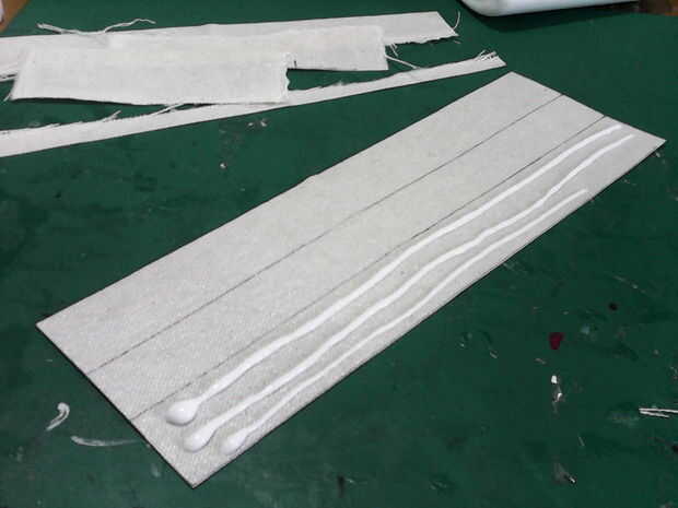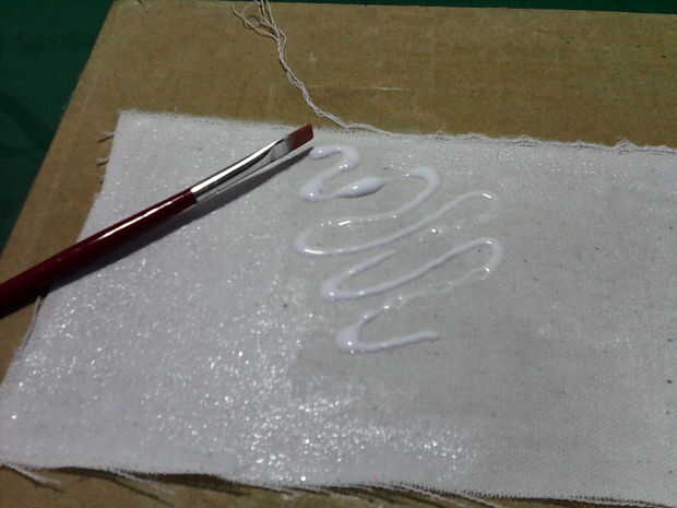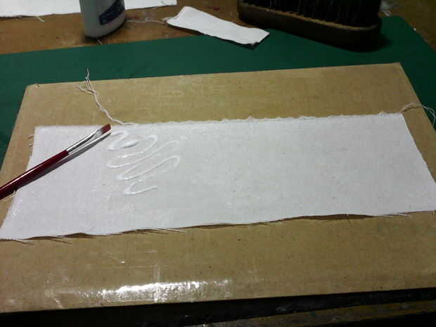 consigue un trozo de lona de aproximadamente el tamaño de la columna vertebral con un montón de margen y completamente la impregnar con pegamento blanco. para ello con una capa muy gruesa de pegamento en el lienzo un cepillo y a la espera de que se seque. repetir ad infinitum. quiere asegurarse de que las roscas en la lona nunca te sueltas. He cepillado en 6 capas de pegamento en este trozo de lienzo (3 por un lado, 3 por el otro). Asegúrese de que su espacio de trabajo está protegido por una pieza de plástico mientras cepilla en el pegamento. esperar a que seque completamente. Ahora usted tiene algo realmente resistente pero flexible y no fray o crack como piel artificial. (fresco, EH)