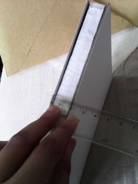 Haz tu tablero de la ilustración y cortar dos hojas del tamaño de tu notebook, para el frente y espalda. Asegúrese de que hay subsidios; tengo un subsidio de 1mm por el borde de mis cuadernos. Haz tu notebook, emparedado entre los dos pedazos de cartón y medir el espesor combinado de la columna vertebral. Observe abajo.