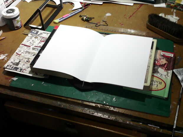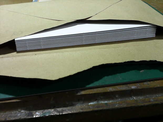 después de que haya terminado, hacer una pequeña instalación para la perforación. sin esta configuración aquí, es difícil asegurarse de que los agujeros todos la tierra justo en el pliegue (a veces se perforan las páginas ellos mismos. no es bueno.)