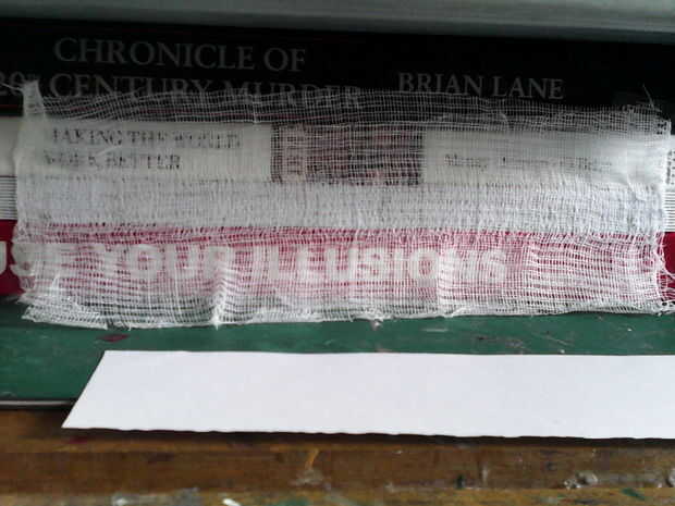 después de coser, toma tu cuaderno y emparedado entre dos libros pesados. Asegúrese de que todas las firmas están alineadas! también, es mejor tener dos grandes libros con cubiertas de brillantes para que el pegamento y la cinta no se adhieren a ellos. Luego, coloque un trozo de Gasa (aproximadamente del tamaño de la columna con un pequeño margen) y colóquelo sobre la columna vertebral. Usted puede con cinta los bordes a los libros para mantener en su lugar. entonces haz tu pincel limpio, introducirlo en alguna cola blanca y pincel pegamento sobre la gasa para pegar a la columna vertebral.