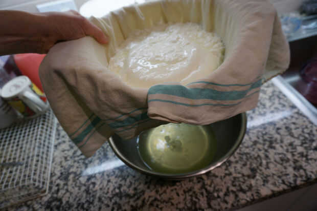 Vierta el yogurt y suero de leche en el queso-estopilla. Espere 5 minutos. Aproximadamente la mitad un litro/cuarto de galón de suero de leche se va a drenar inmediatamente muy bonita.