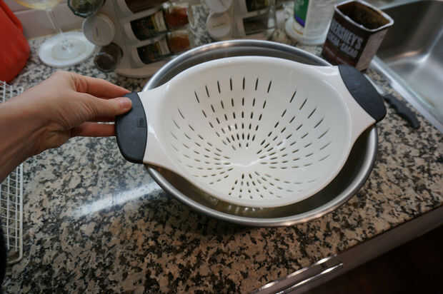 Tome su colador de espaguetis (colador) y anidar dentro de un cuenco grande. El recipiente debe ser que lo suficientemente profundo el filtro no toque el fondo.