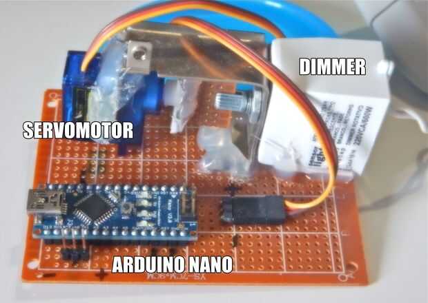 La parte electrónica es dejar de fumar sencillo. El LM35 salidas una tensión proporcional a la temperatura (10mV / ° C). Nuestro objetivo es 370mV. Este voltaje se alimenta para entrada analógica 0 de Arduino. El Arduino calcula el valor necesario para que el error igual a cero y envía este valor digital 9 de entrada-salida, que alimenta el servomotor. Puesto que el regulador está acoplado mecánicamente al servo, esto significa que el Arduino controla el regulador de luz.
