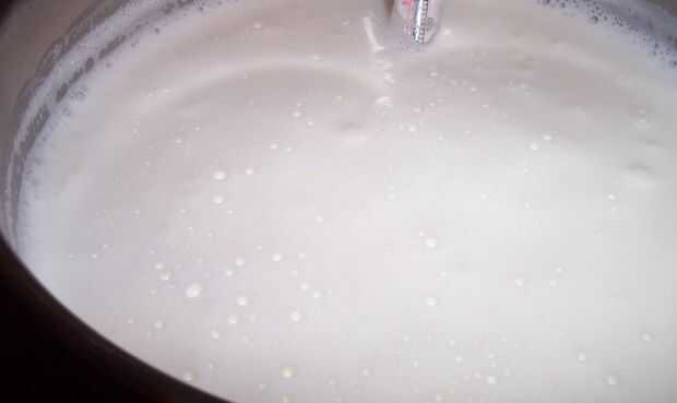 En la etapa de escaldado, la leche comenzará a buscar espumosas y verá pequeñas burbujas subiendo a la superficie rápidamente. Esto sucederá a unos 200 grados F.
