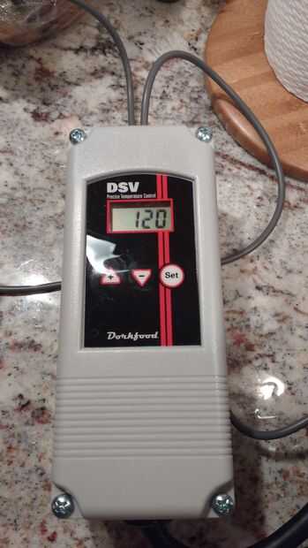 Control • sous-Vide. He utilizado el Dorkfood controlador del temperatura de Sous-Vide (DSV) (también de Amazon - $99,00). http://www.Amazon.com/GP/Product/B0088OTON4?PSC=1&... Esto tiene una sonda de temperatura, una lectura de salida digital y una salida que enchufe la olla en.