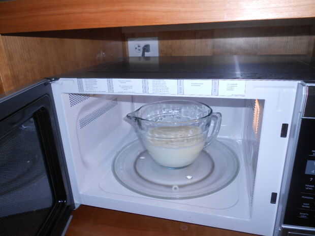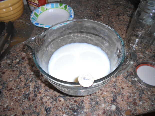 Necesita calentar la leche a unos 180 grados F. La leche viene pasteurizada de la tienda pero podría recoger algunas bacterias salvajes que podrían impartir un sabor apagado. Se trata de pasteurización temperatura relativamente baja, por lo que debe preservar la integridad de la leche. Yo uso el microondas, me tarda 8 1/2 minutos en alta en el recipiente de vidrio. Los resultados variarán dependiendo de su tazón de fuente y microondas. Les recomiendo a partir de 5 minutos y tomar a una temp y furtivamente para arriba en él la primera vez. Usted no quiere a hervir la leche. Confía en mí, lío grande. Si no tienes microondas, calentar la leche en la estufa pero observa atentamente, no desea realmente esto hervir.