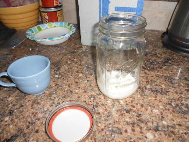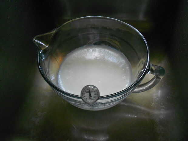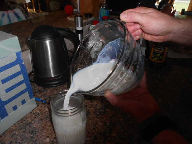 Cuando la leche llega a la temperatura correcta, 115F-120F, verterlo en la boca ancha canning jar con la cultura o último pedacito de yogur de la última hornada. Asegúrese que la jarra esté limpio, un recorrido por el lavavajillas o lavarse las manos caliente buena es una buena idea. Trabajo limpio garantiza resultados consistentes.