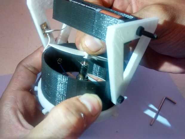 Poner la tapa en la base y la hélice en el motor, observe que la hélice esté apuntando hacia abajo a la batería.