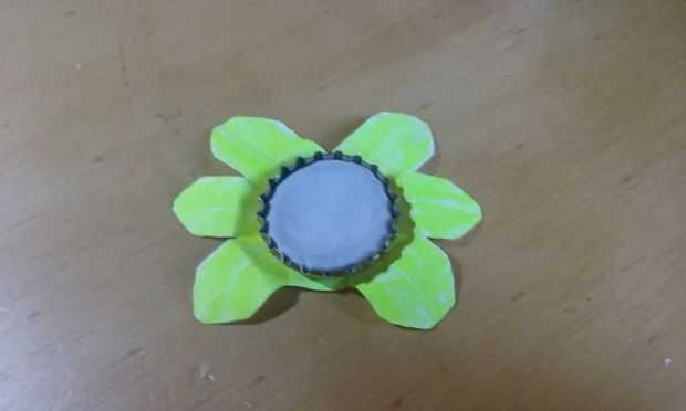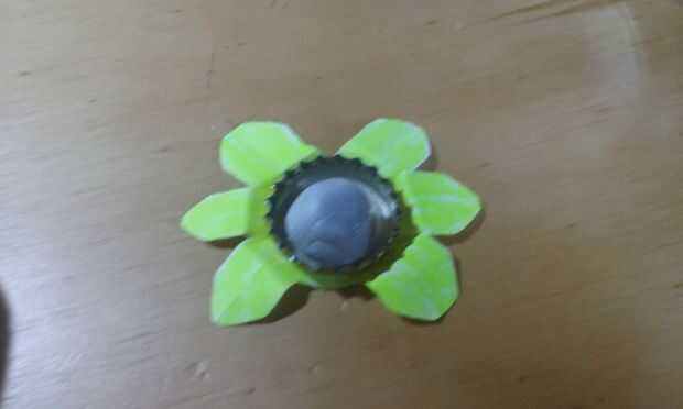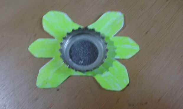 Ahora poner ese rollo de cinta en la parte posterior de la tapa de la botella y se adhieren a los pétalos