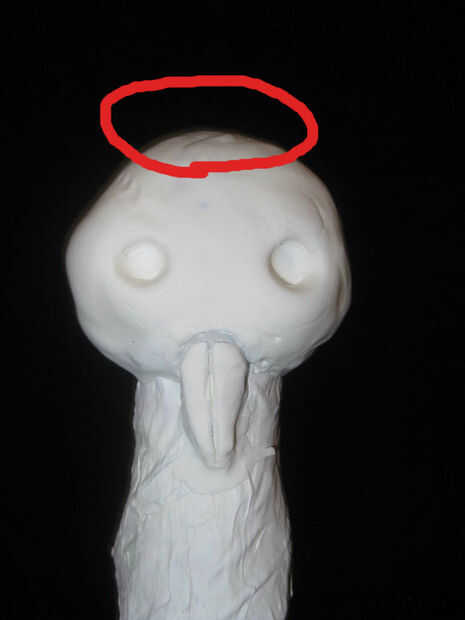 2. Utilice más arcilla de aire seco en la parte superior de la bola de masilla de epoxy para formar el cráneo, pero asegúrese de que lo disminuyen y dejar la masilla endurecida expuesta. (ver círculo rojo) De esta forma la masilla duro-a puede llevar la peor parte de ser ajustada repetidamente en el suelo sin tener el aire seco crack de arcilla de la parte inferior.