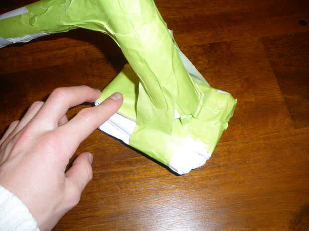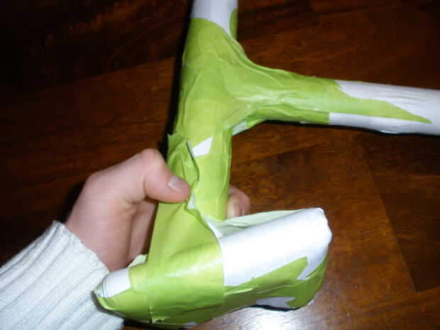 Después de que el martillo se hace fijar el papel 2 que fueron grabados previamente.  Poner la parte del martillo abajo de plano sobre la mesa y luego alinee uno de los extremos de los 2 rollos en el centro del martillo.  Luego rollos de cinta todo alrededor del borde hasta la parte del martillo es firme y robusto, pegadas a los 2.
