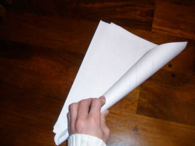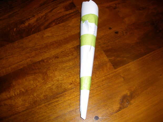 Tomar algún papel chatarra (sobre hojas de 50-75) y hacerlas rodar a partir de la esquina inferior derecha.  El papel como esta forma idéntica a un cono de helado.  Un punto en un extremo y un cono abierto en el otro extremo.  (El lugar donde pones el helado).  Cinta de papel enrollado en la parte inferior, media y superior.  (ver imagen).