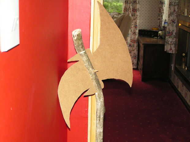 estoy en una producción de Noises Off y uno de los apoyos necesitados es un hacha de bombero. La solución propuesta fue tomar un plástico woods mans hacha del mago de Oz y poner algunos rojo pintura en él. El resultado fue... bueno... pasable tal vez
